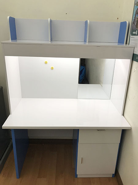Các mẫu bàn học trên thị trường hiện nay đều dùng đèn bàn chiếu sáng trực tiếp xuống mặt bàn học. Do đó không giải quyết được vấn đề chói lóa và chỉ sáng cục bộ dưới ánh đèn. Một số đèn bàn có thiết kế chao chụp để giảm chói, tuy nhiên cũng không bớt được nhiều. CHÓI LÓA, SÁNG CỤC BỘ, SẤP BÓNG, là các vấn đề nghiêm trọng của bàn học truyền thống gây ra các bệnh lý về mắt |