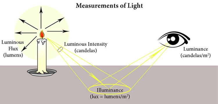 Đơn vị đo là Candela (nghĩa là nến). Là mật độ năng lượng phát ra từ một nguồn sáng trong một hướng cụ thể, hay có thể được định nghĩa là quang thông theo một hướng nhất định phát ra trên một đơn vị góc khối (1cd = 1 lumen/steradian). Một nguồn sáng 1 candela (tương đương với một ngọn nến thông thường) sẽ phát ra 1 lumen trên một diện tích 1m2 tại một khoảng cách một mét kể từ tâm nguồn sáng. Các phép đo cường độ sáng phải thực hiện trong phòng đo được thiết kế chuyên biệt và sử dụng thiết bị đo gọi là goniophotometers.